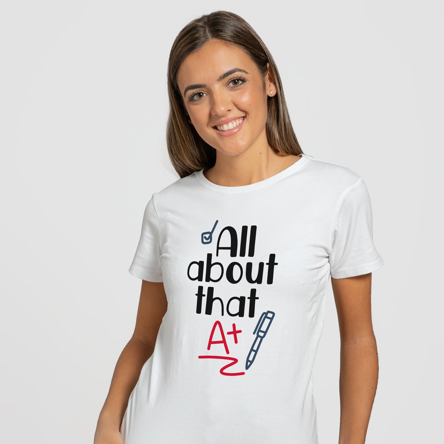 Whether you're acing exams, crushing deadlines, or just rocking life in general, this T-shirt is the perfect way to show off your stellar achievements. The witty "All about that A+" design in bold black will have everyone laughing and admiring your dedication to excellence.