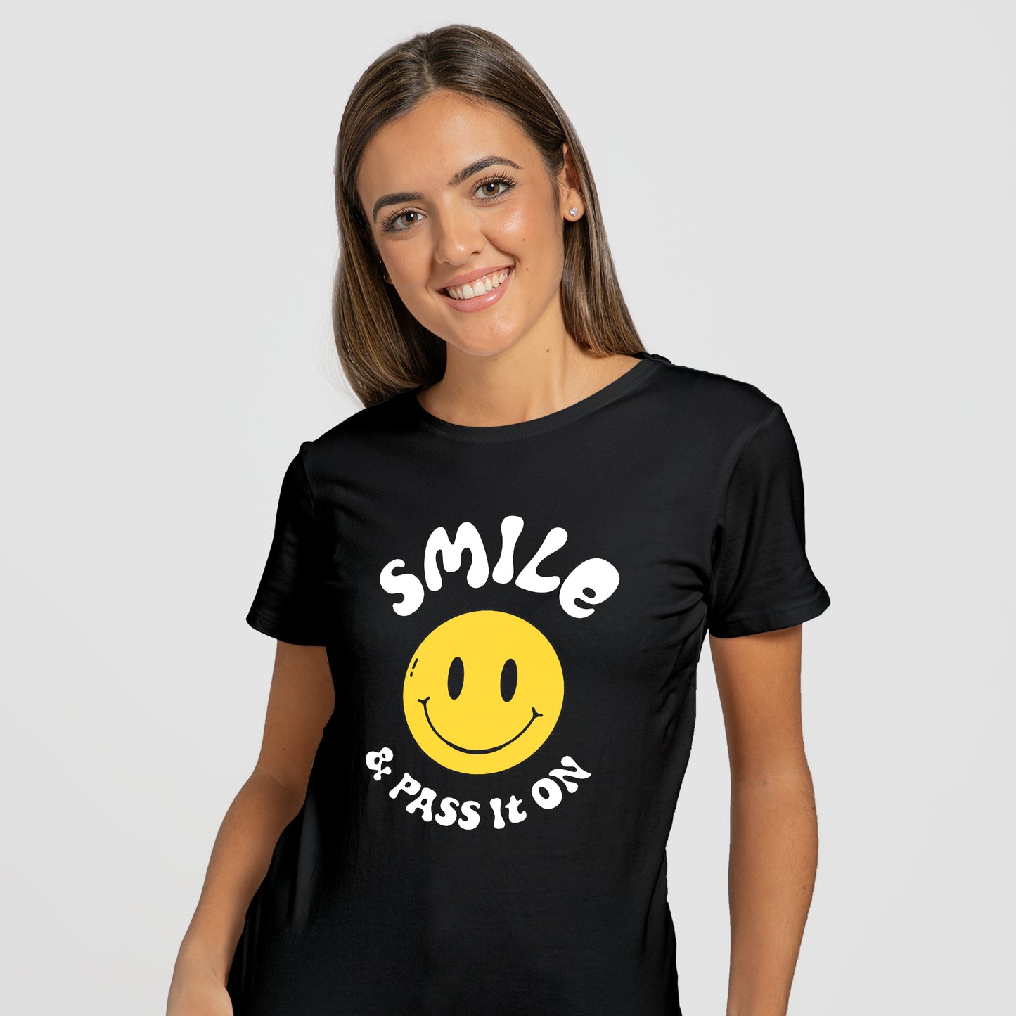 Spread positivity and support mental health with the Smiley & Pass It On T-Shirt. This comfortable t-shirt not only looks great, but also helps to promote a positive mindset. Spread joy and inspire others by wearing this uplifting shirt.